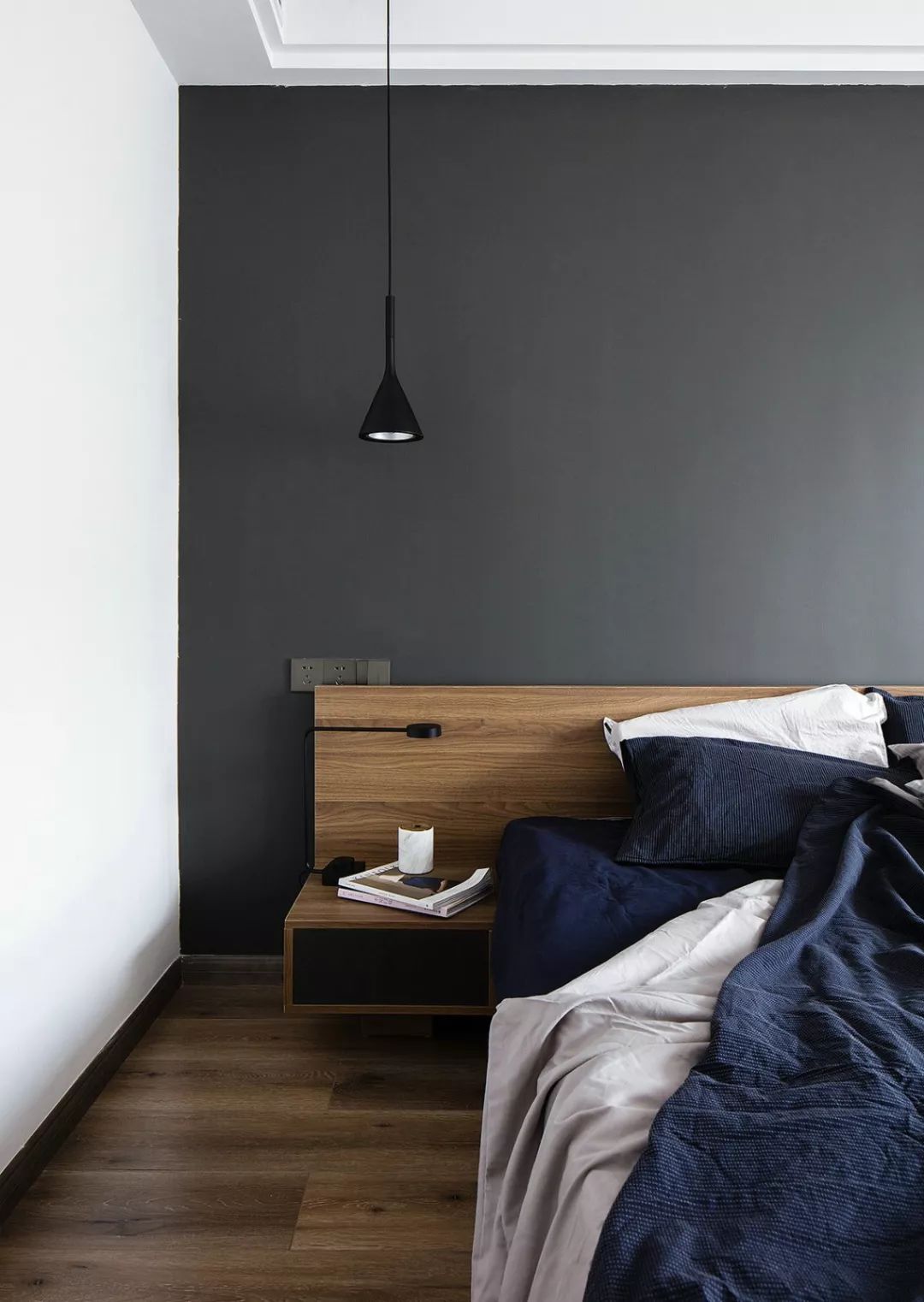 主臥的床頭背景墻刷成了深灰色,結(jié)合白色的墻面、吊頂和深藍(lán)色的床品,給人一種精致大方的感覺。