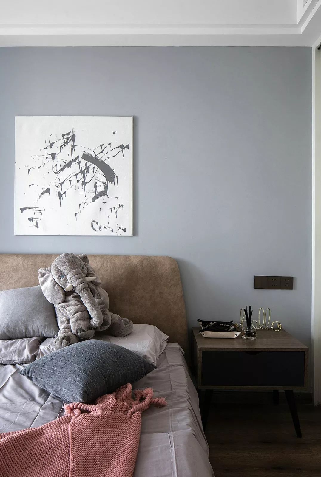 次臥的床頭背景墻刷成了藍(lán)灰色,搭配隨意極簡(jiǎn)的裝飾畫、棕灰色的床頭靠背,營(yíng)造一個(gè)輕松松的空間,令人感覺愜意而又自然。