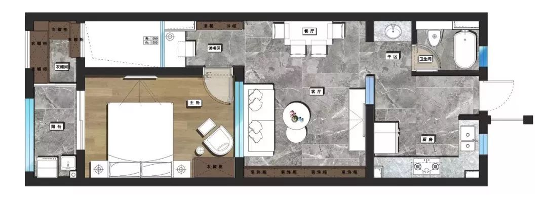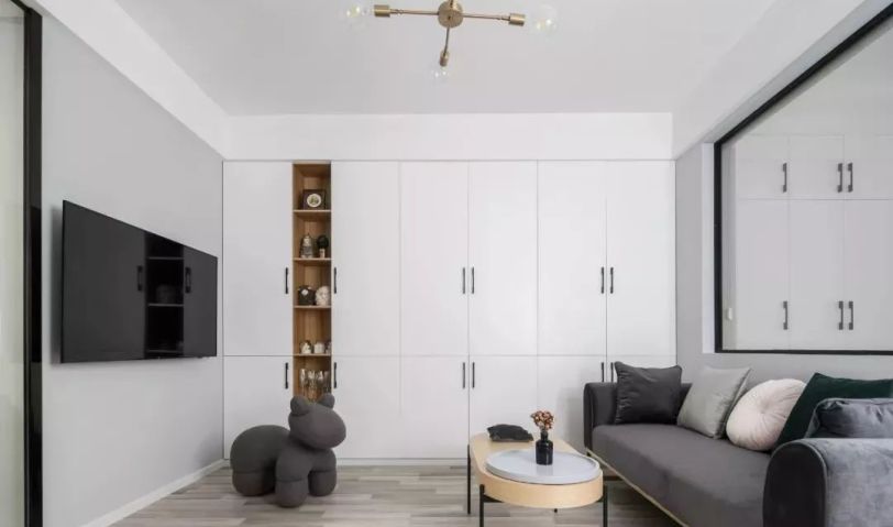 客廳位于餐廳的另一側(cè),迷你的茶幾讓空間更顯寬敞。在客廳的一側(cè)做上了嵌入式的到頂柜子,給這個(gè)小窩增添了不少的儲物空間。