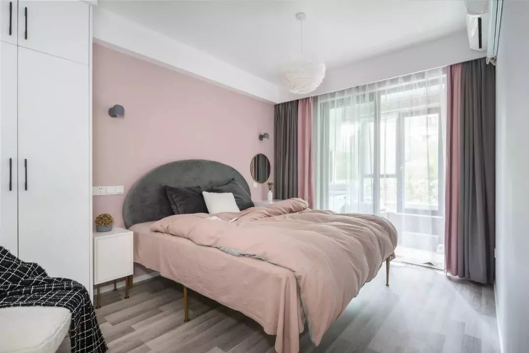 主臥室的內(nèi)部是以粉色為主,背景墻和床品、窗簾都加入了粉色調(diào),再加上細(xì)節(jié)處點(diǎn)綴一些金屬元素,讓整個(gè)臥室變得更加優(yōu)雅、精致。