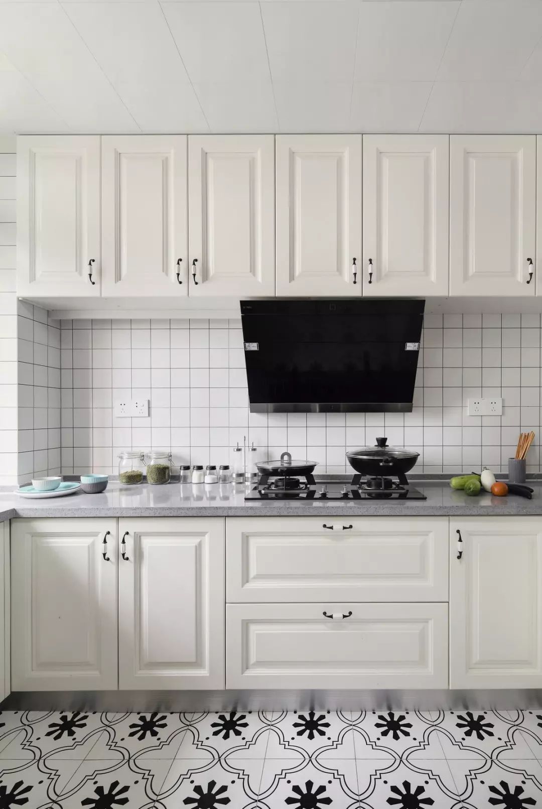 廚房內部的空間比較寬敞,櫥柜是做了L型的布局,地面的黑白色花磚搭配白色的櫥柜和墻面小白磚,再加上灰色的踢腳線和臺面,黑白灰的經典搭配更顯簡約時尚。