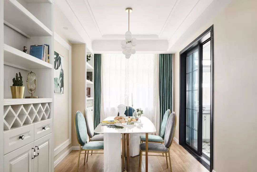 在房子另一側的餐廳空間,兩個餐邊柜中間留出了裝飾的背景墻,同樣精致優雅的餐桌椅,讓餐廳也變得更為高檔大方