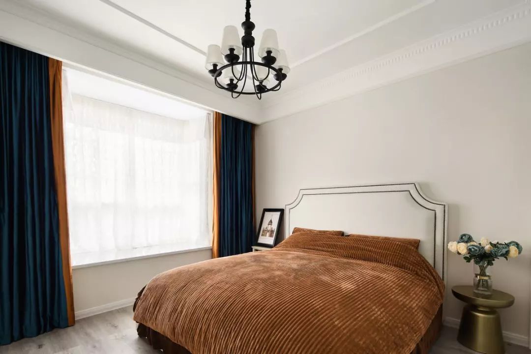主臥干凈的墻面基礎氛圍,造型優美的床頭靠背搭配橙色的豎紋被單,而飄窗內側掛上橙色拼深藍的窗簾,呈現出一個滿滿活力的空間。
