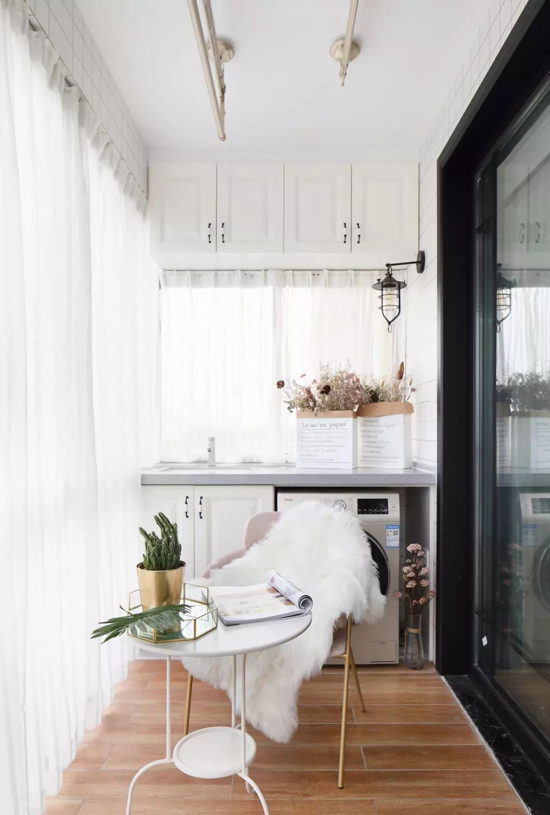 陽臺處把實用性和顏值都做到了位,洗衣機、洗手臺加上晾衣桿,底部擺放輕便的休閑桌椅,方便隨時挪動位置。