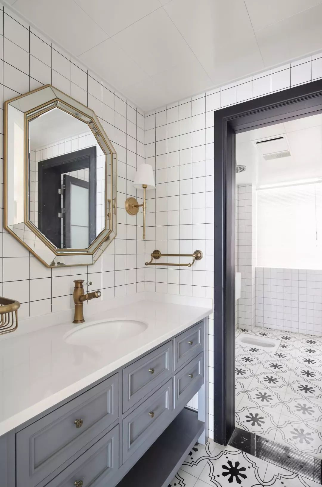 公衛的洗手臺被放在了門外,衛生間內外都鋪貼了一樣的花磚,公衛內用蹲廁來代替馬桶,在使用上也會更為方便一些