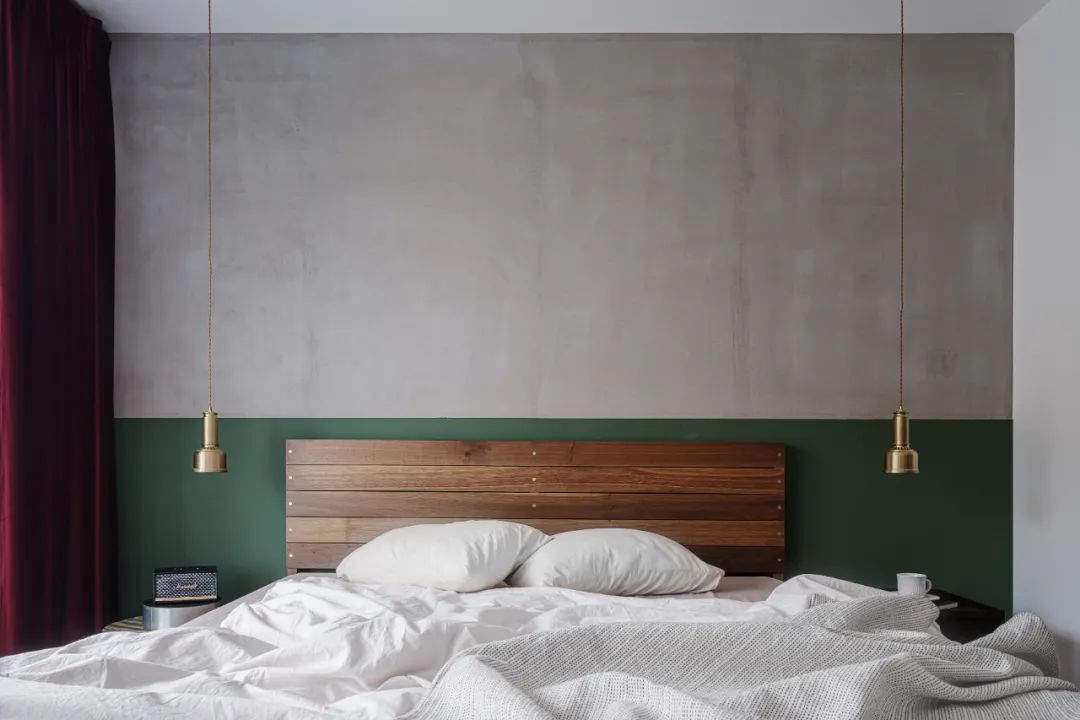 臥室采用綠色及灰色的搭配,呼應空間主體的同時,能夠將深色系木制床襯托的更具有質感