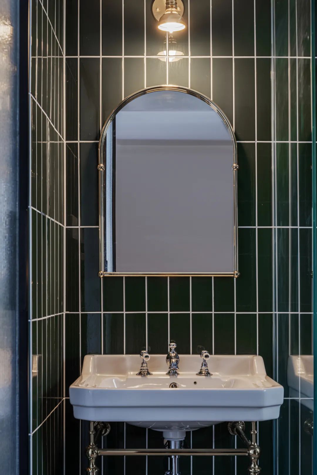 衛生間延續了整體工業與復古融合的基調,墨綠色的墻磚質感更顯突出。