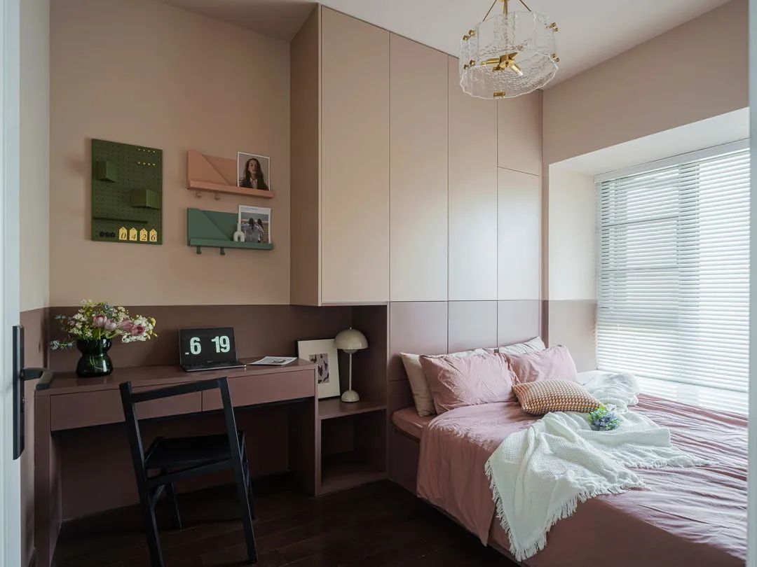 書(shū)房從功能性延展出發(fā),采用定制設(shè)計(jì),做了榻榻米、衣柜和書(shū)桌一體設(shè)計(jì),滿足了客房、辦公、休閑等需求。由于空間不大,屋主又不希望過(guò)冷設(shè)計(jì),因此采用上下分色,以漿果色搭配灰粉色。