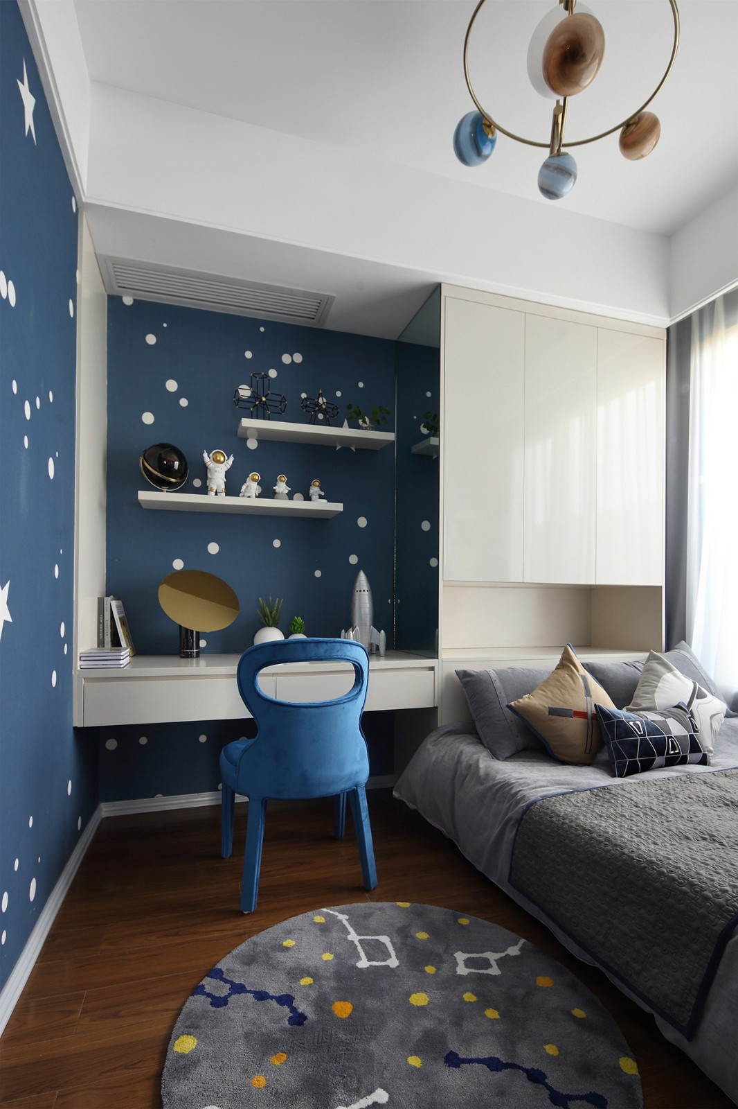 兒童房采用爛漫的星空探索主題,藍色的星空與頭頂的星球,都頗具趣味,激發孩子關于宇宙的無限想象力。