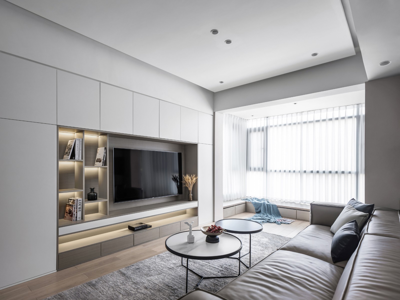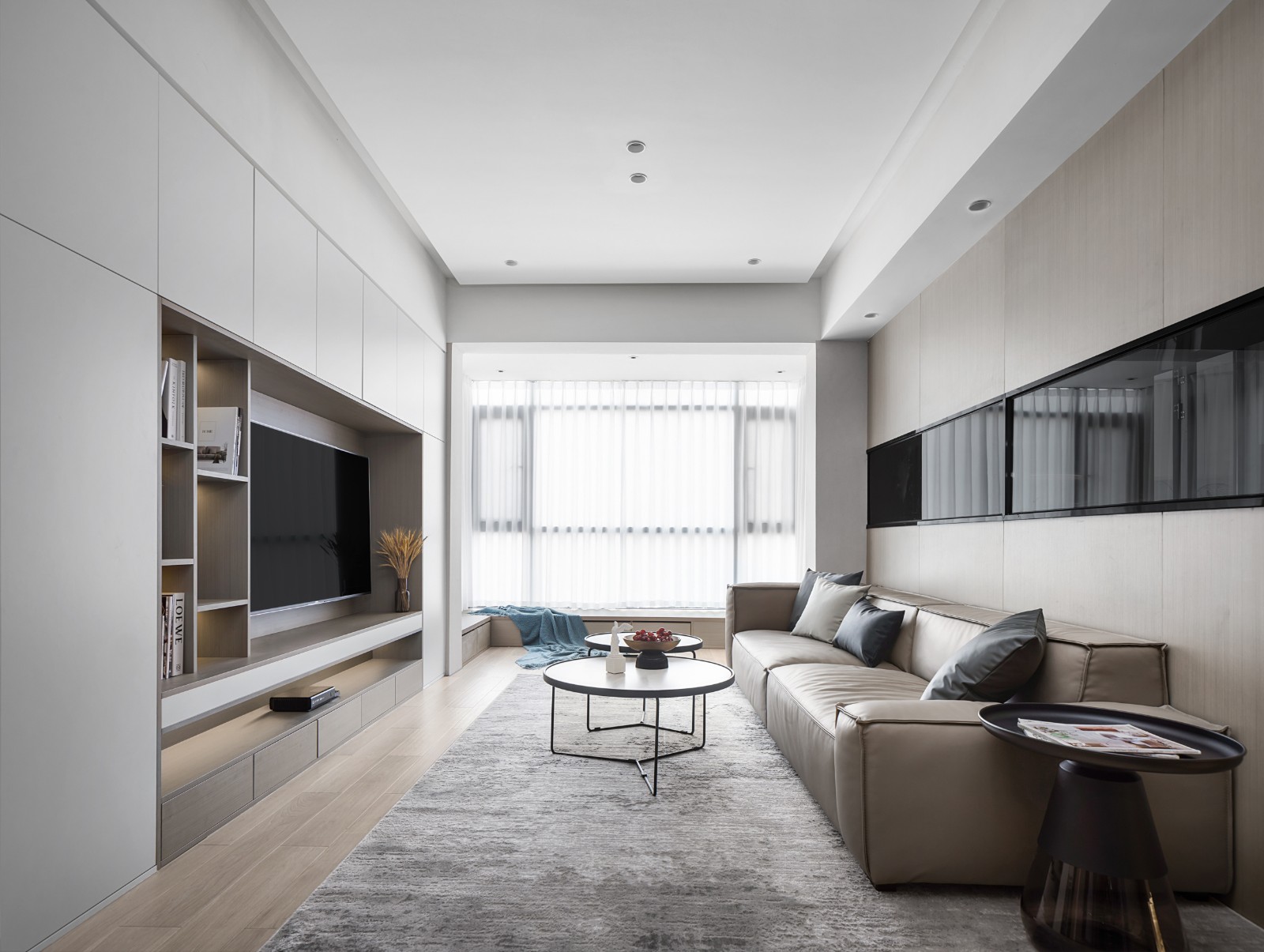 客廳以木色和白色為主調,黑色為點綴,透過不同的材料質感及空間體塊,讓空間呈現出別致的層次感,既提升了空間的明亮度,也體現了藝術審美。