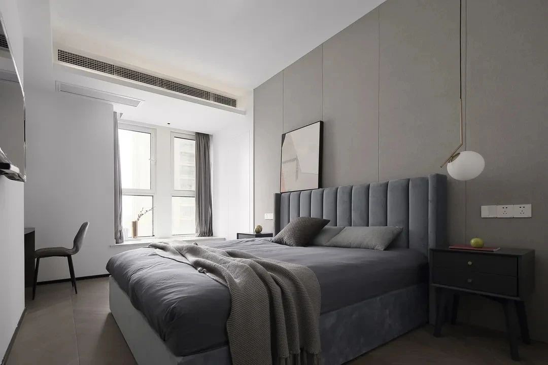 深沉而內斂是主臥室的基調,明暗之間是光影的游戲也是設計的巧思。