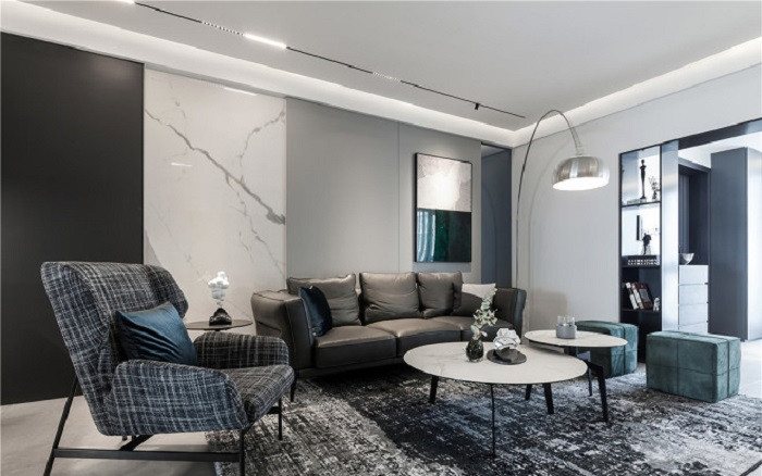 材質(zhì)顏色上面使用了深灰色的護(hù)墻板,中灰的皮沙發(fā)還有地毯,黑色巖板的電視柜,角幾和單人椅子加上華爾思音響。通過(guò)多處巖板過(guò)渡,使得整個(gè)空間顯得非常有層次感和***感。