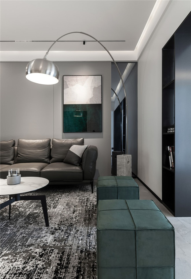 入戶右手邊也設(shè)計(jì)了單獨(dú)的矮柜,銜接黑色不銹鋼材質(zhì)書架,讓整個(gè)客廳空間有了過(guò)渡性。