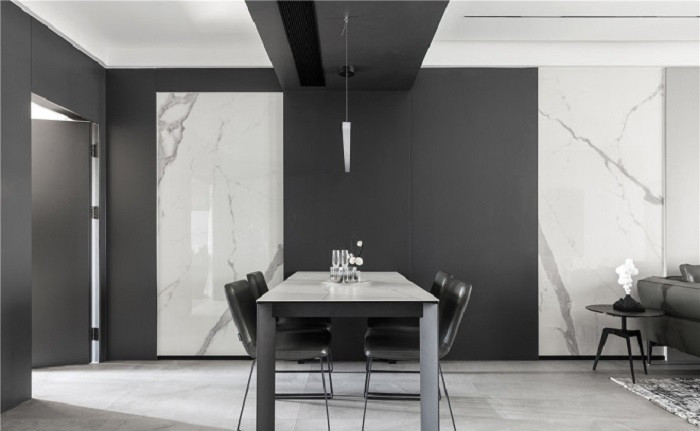 餐廳部分是黑白灰基調(diào), 通過(guò)巖板餐桌和墻面巖板的映襯, 還是很配我們的極簡(jiǎn)風(fēng)格。