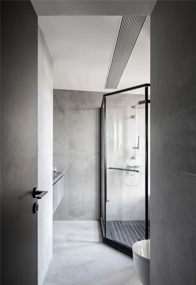 衛(wèi)生間以灰調(diào)墻磚配以白色潔具,還是和客廳一樣的基調(diào)。設(shè)計(jì)了無(wú)擋水條的處理。淋浴區(qū)下沉3公分,加長(zhǎng)型地漏。注重整體性,所有包括客餐廳的地磚及衛(wèi)生間墻地磚,采用了美縫劑。盡量找和磚最接近的顏色。