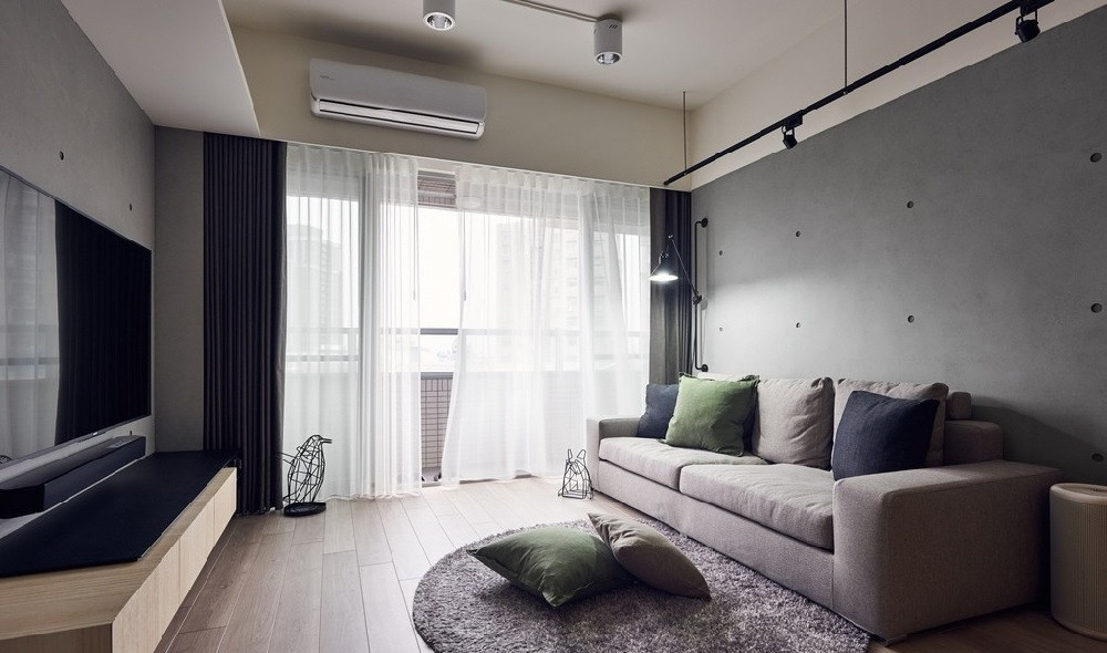 客廳空間,背墻是新作的墻面表面使用清水模涂料。