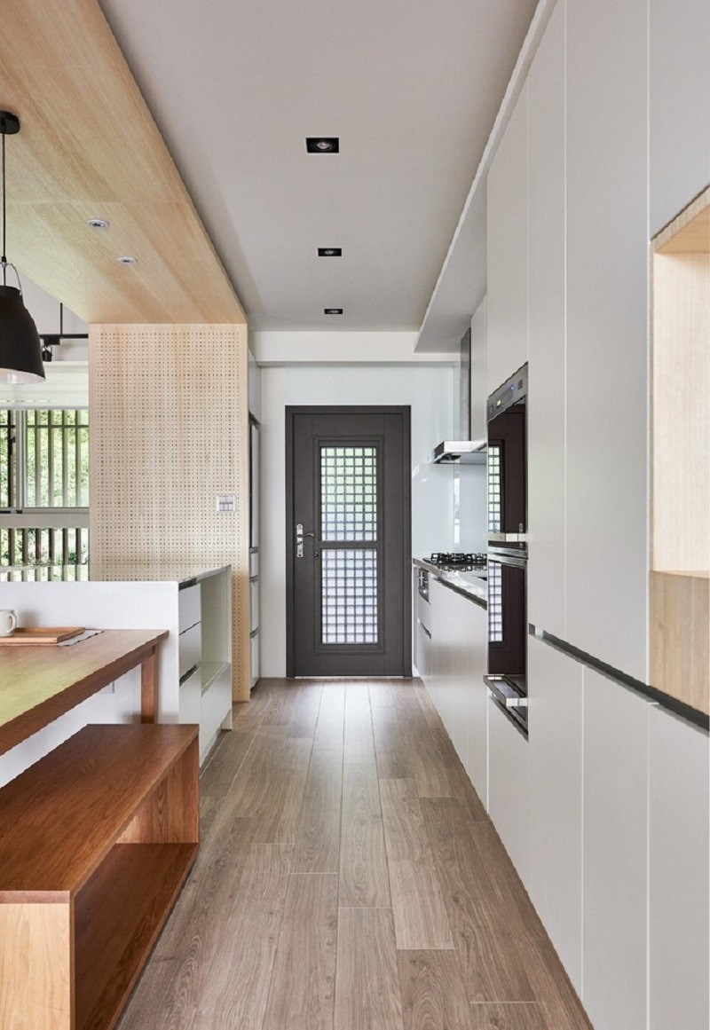 冰箱柜隱藏在洞洞墻的后方,因為深度關系,冰箱后柜也可以利用變成淺收納柜。