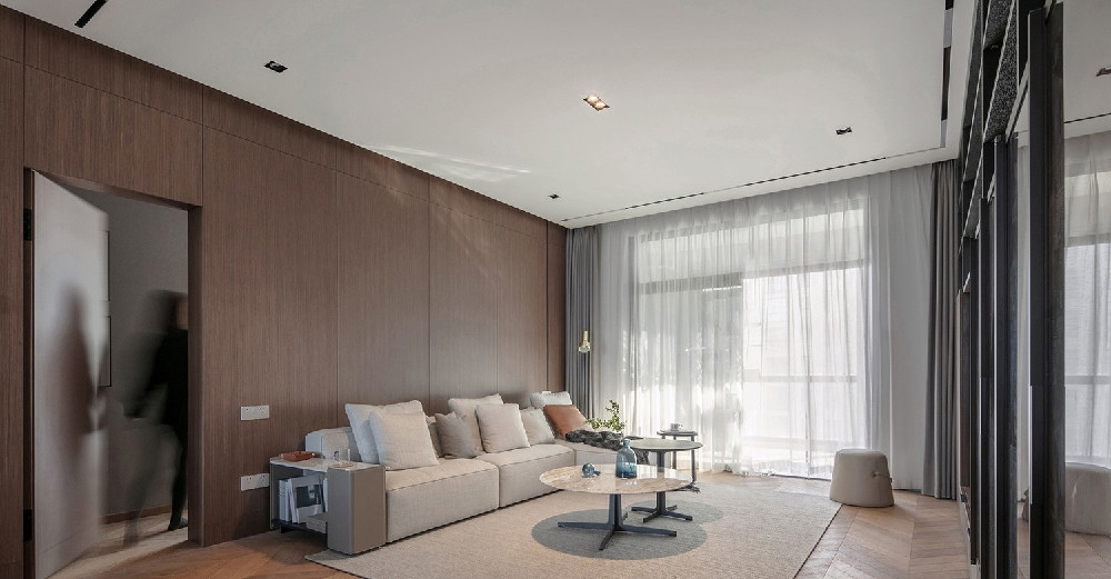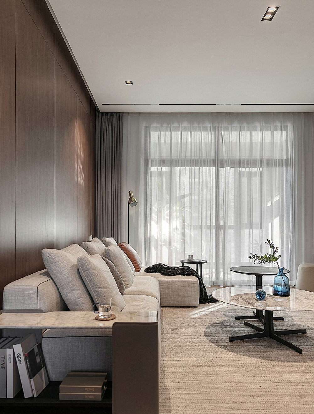 模塊化組合的沙發和邊幾,搭配著背景墻的簡潔,對應著地毯的圍邊,端莊又靈動。