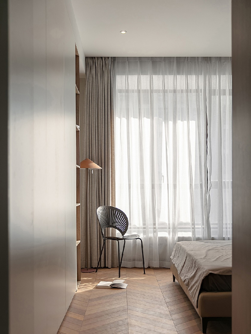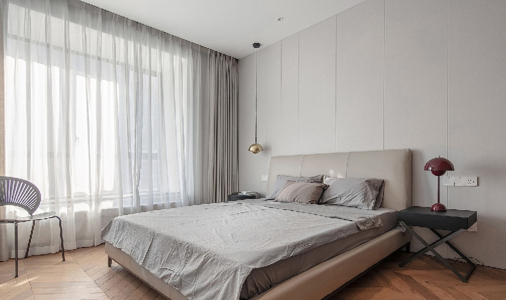 主臥的光線夠好,屋主也希望可以簡潔明亮,床頭淺色的布墻板系統,恰好滿足了空間需求。