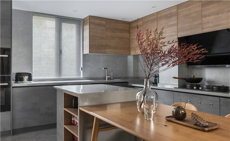 入戶區(qū)設(shè)計(jì)師對(duì)原有的布局進(jìn)行了調(diào)整,封閉的廚房區(qū)域與逼仄的餐廳區(qū)域都得到了釋放,改造后的廚房除了擁有更好的采光和動(dòng)線以外,還增加了島臺(tái)區(qū)域,空間的靈活性和延伸感都得到了增強(qiáng),實(shí)現(xiàn)了功能化。
