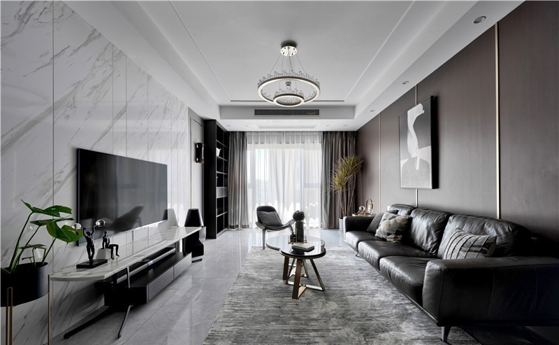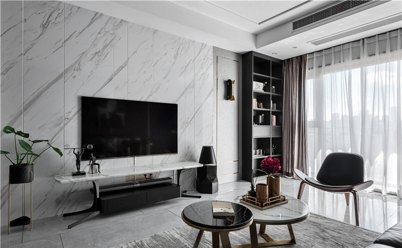 電視背景上采用整張大理石處理,并根據紋理的走向切割不同規格的尺寸體現立體感,左右配以硬包以及金屬條圈邊提升層次。