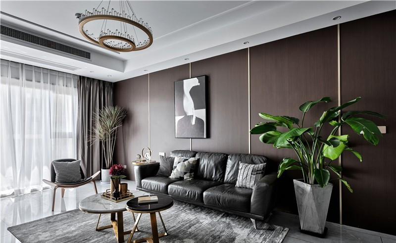 沙發背景采用深木色飾面板滿貼,其中等分內嵌金屬條,讓整體飾面板更有設計感,富有層次。