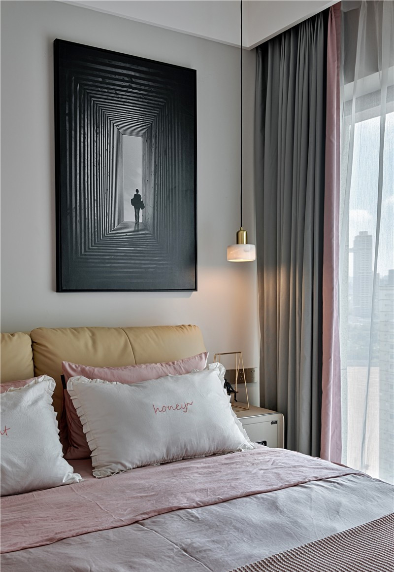 在設計上,我們在主臥處理上并沒有延續客廳的冰冷感,而是營造了溫暖宜居的精致空間。