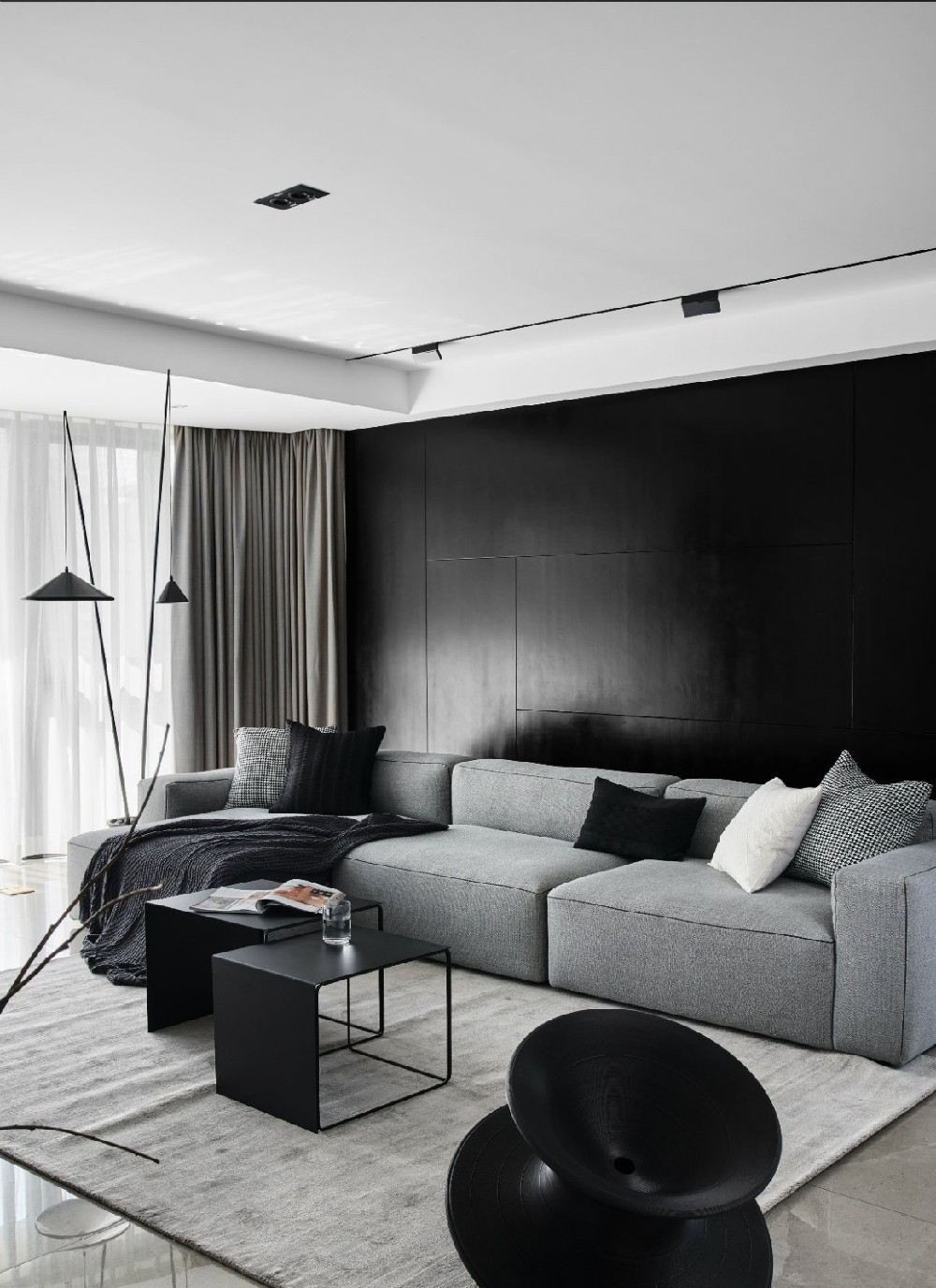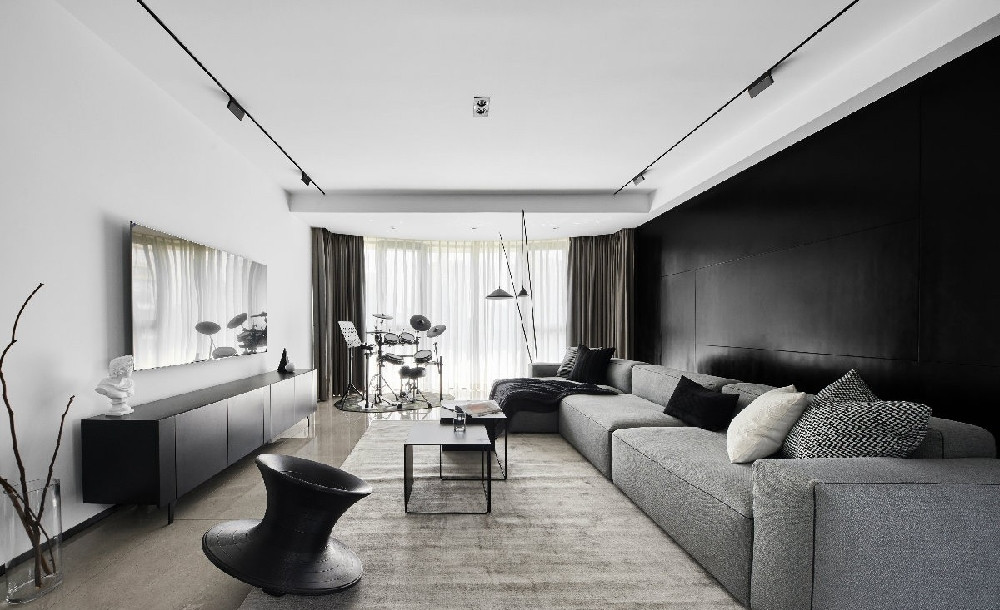 整個(gè)客廳空間采用黑白灰的基調(diào),灰色L型沙發(fā)搭配黑色背景, 點(diǎn)綴千鳥(niǎo)格抱枕,線條簡(jiǎn)約流暢,色彩對(duì)比強(qiáng)烈。