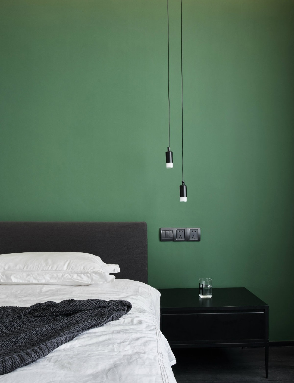 因?yàn)槲葜飨矚g綠色,綠色是讓人具備安全感的顏色,還有寧神的作用,所以主臥墻體大膽采用森林綠,黑胡桃木家具,和白色床品形成對(duì)比,在沉靜的空間中,儲(chǔ)備的新能量。
