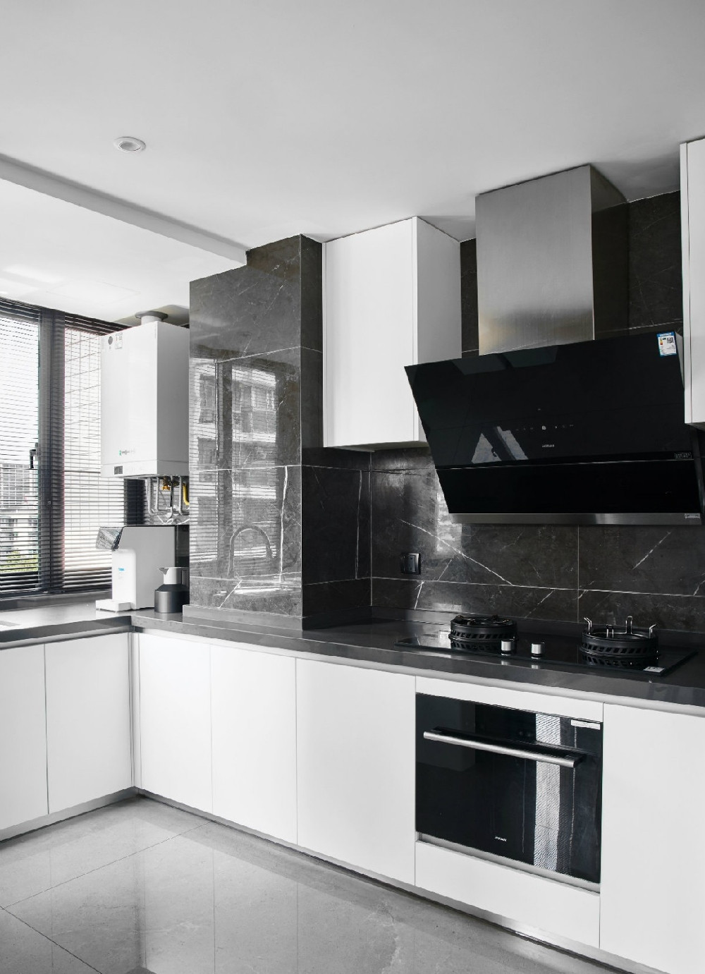 廚房依舊是采用黑灰白色調(diào),潔凈的感覺(jué)在這里做瑜伽打坐都沒(méi)問(wèn)題。