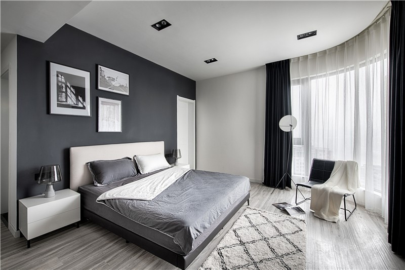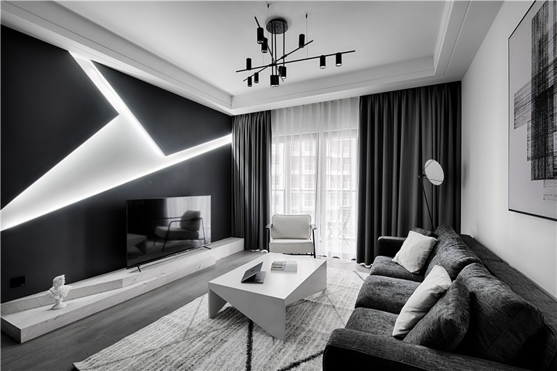 沙發和窗簾是不同灰度使用,大白墻只用一幅抽象的黑白掛畫裝飾。