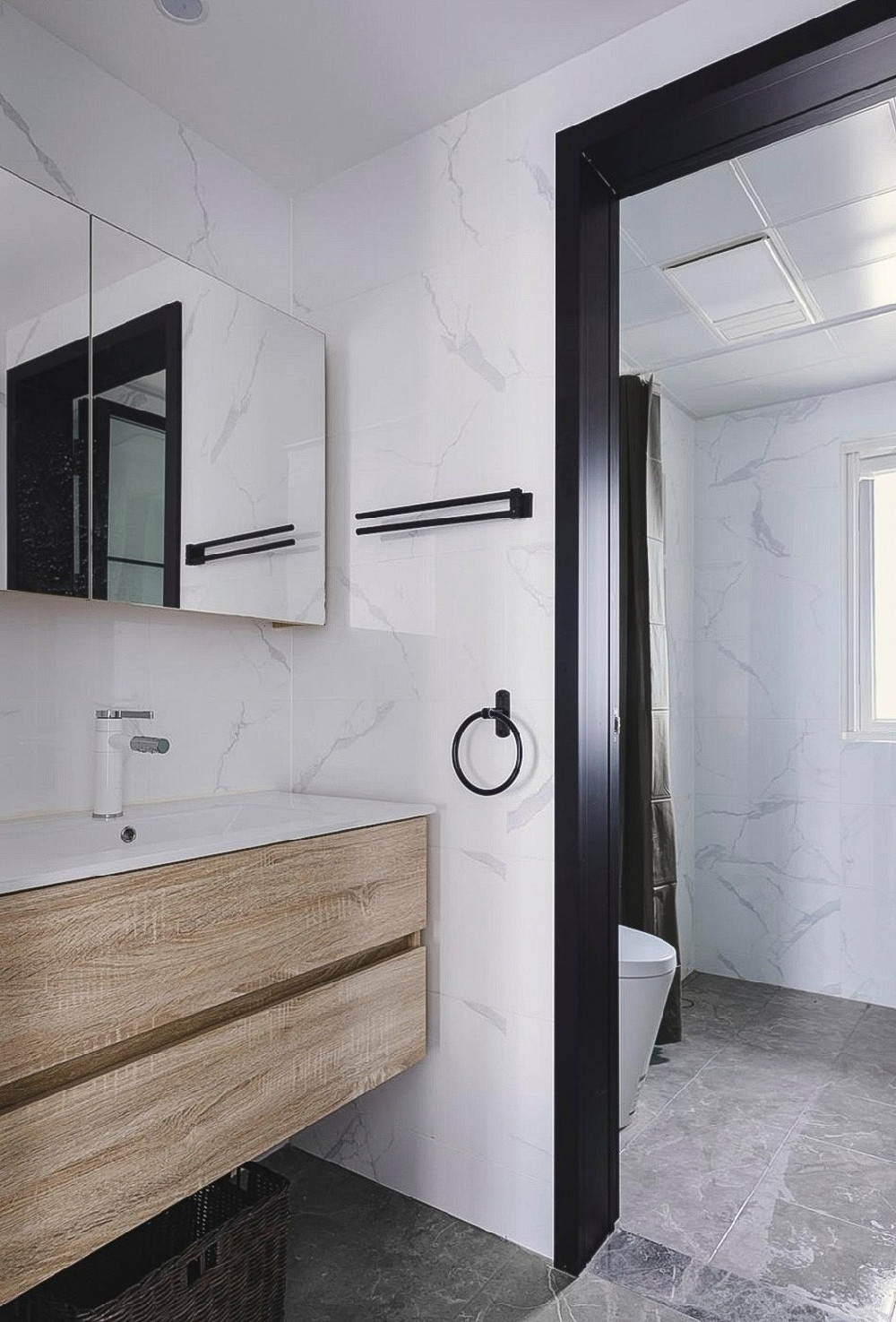 同樣以黑白灰為主色調(diào)的衛(wèi)浴空間,加入木色臺(tái)盆柜的設(shè)計(jì),空間層次更分明。