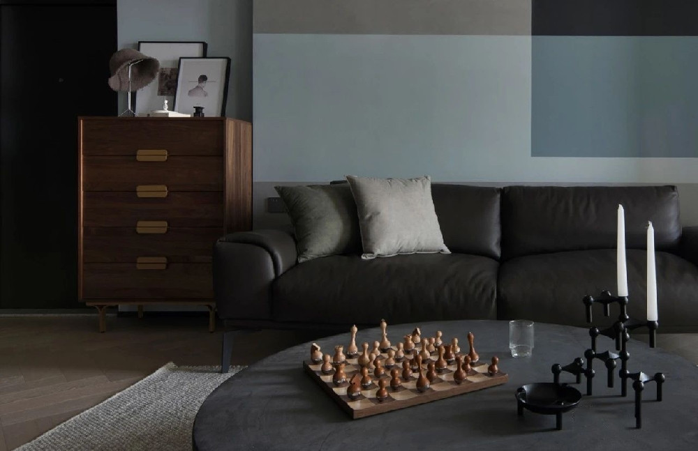 客廳選用的茶幾,表面的水泥質(zhì)感明顯可見(jiàn),為空間奠定復(fù)古格調(diào)。同時(shí),圓的造型方便家人圍坐,無(wú)論下棋還是桌游,只要聚在一起,就能制造不平常的記憶。