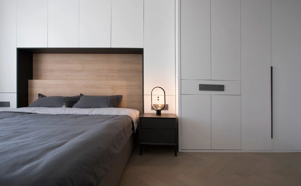 臥室是一個(gè)完全私密和放松的場(chǎng)所,摒除不必要的裝飾,減少生活的累贅。墻面上毫無(wú)多余修飾,床后白色的收納柜在營(yíng)造簡(jiǎn)潔氛圍的同時(shí)可以存放大量書(shū)籍,滿(mǎn)足H喜愛(ài)在房中看書(shū)的需求。
