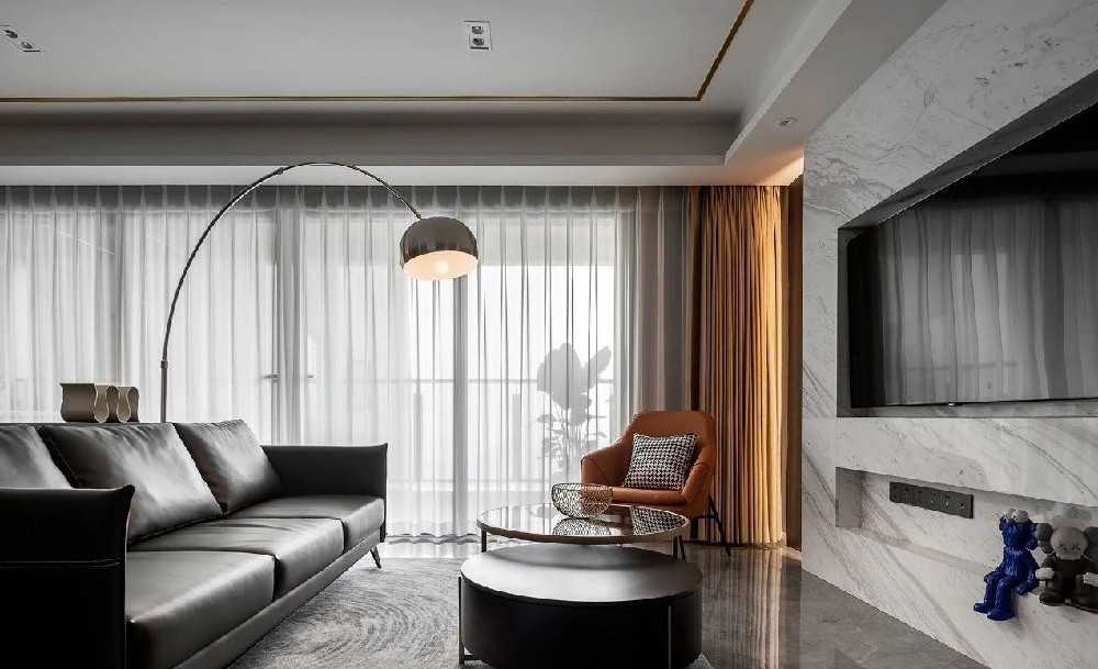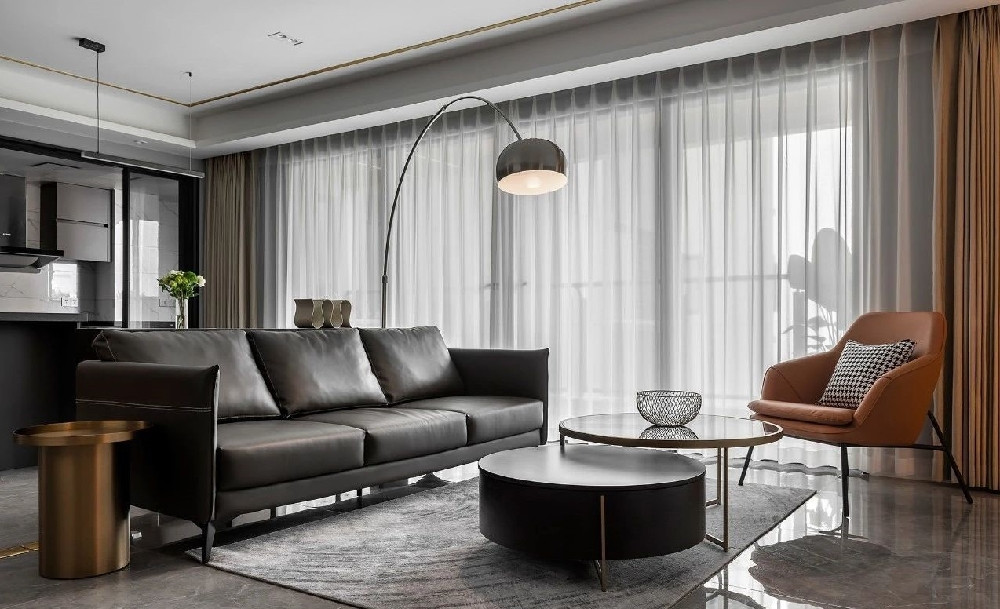 客餐廳以灰色為主調,深色主沙發配高飽和色休閑椅,金屬元素點綴精致細節