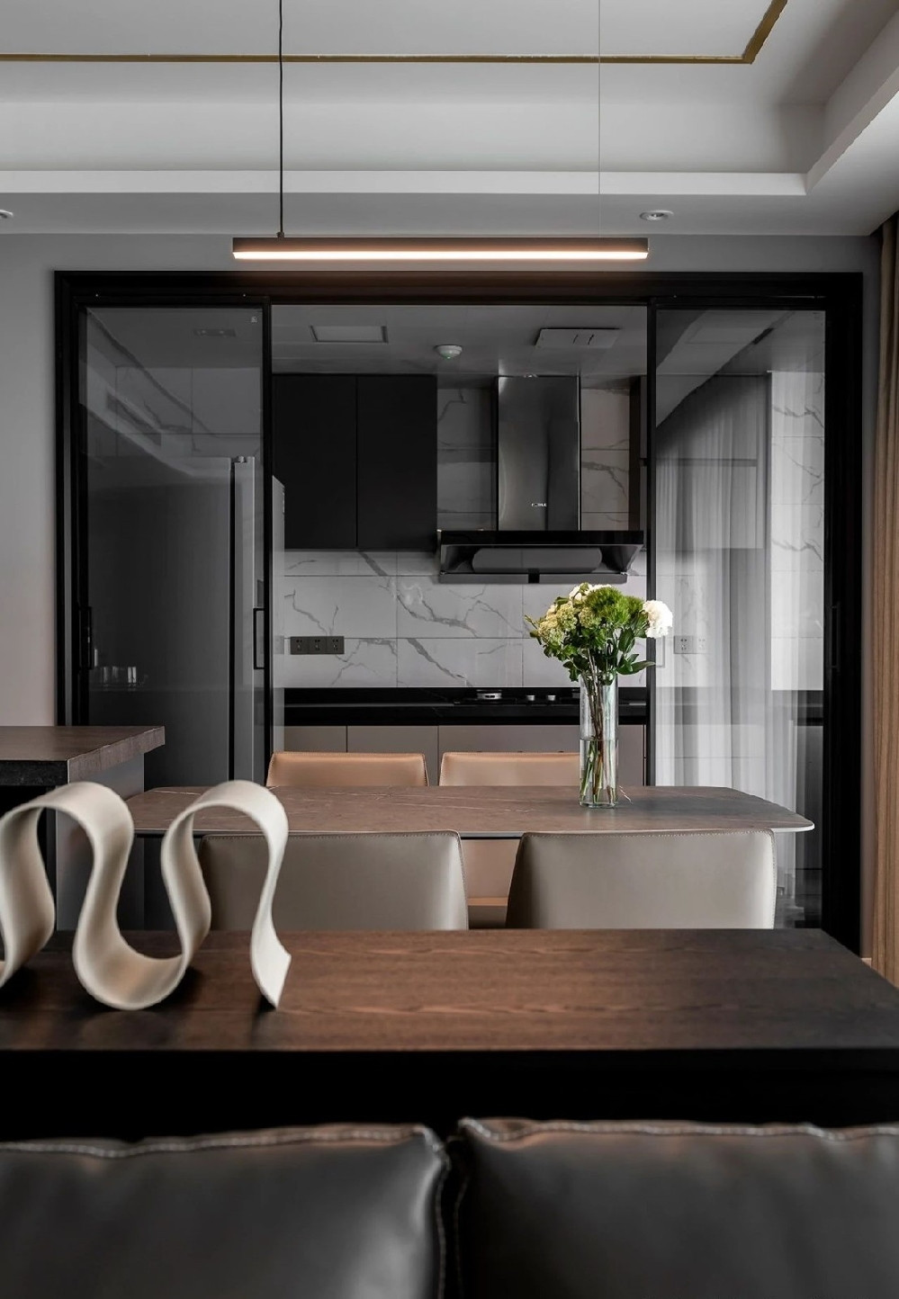 沙發背靠一組收納矮柜,兼具餐廳的收納機能