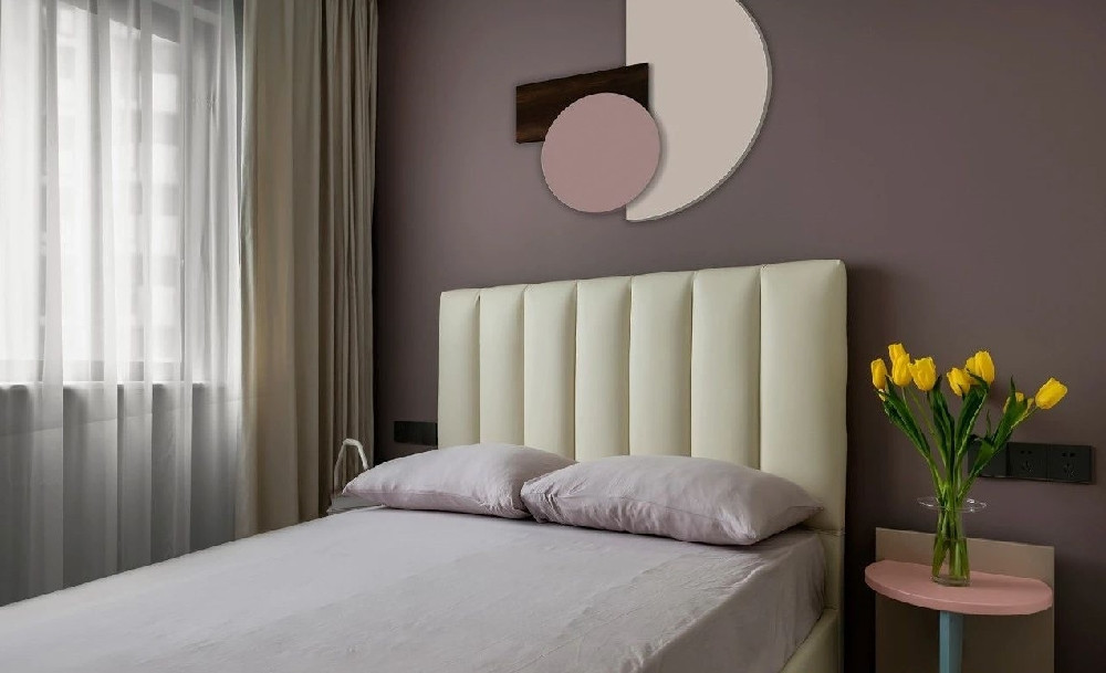 另一個次臥以優雅柔美的風格打造,紫粉色系的墻面與墻飾搭配米白色床架,床頭柜俏皮有設計感,與墻飾呼應