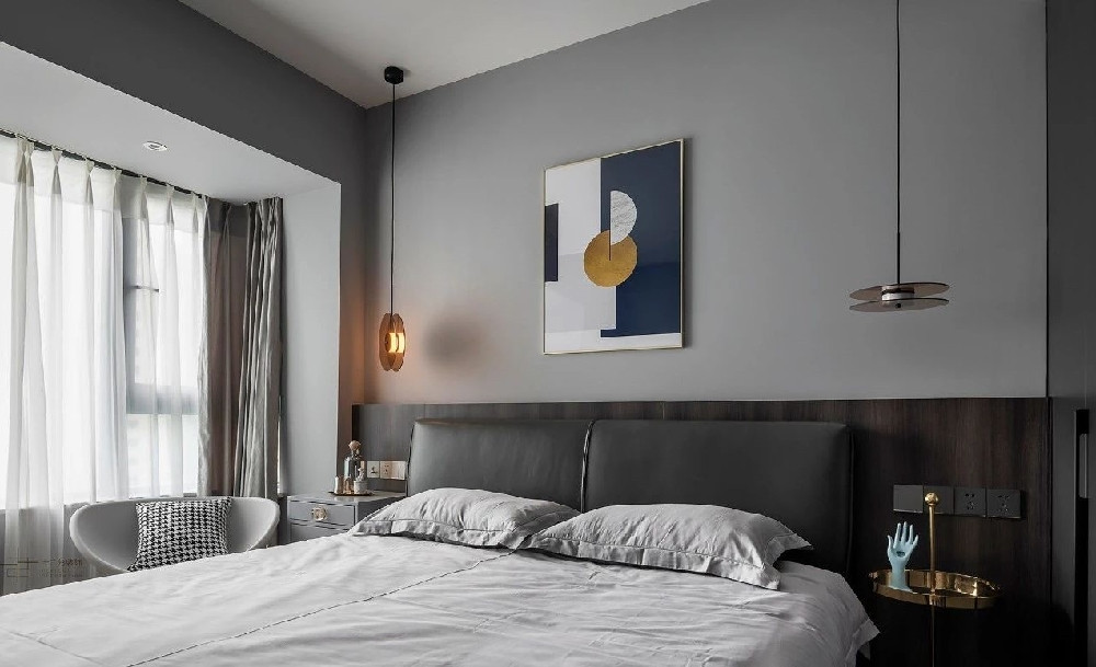 主臥的主色調延續客廳基調,黑灰色中點綴些許金屬色提亮