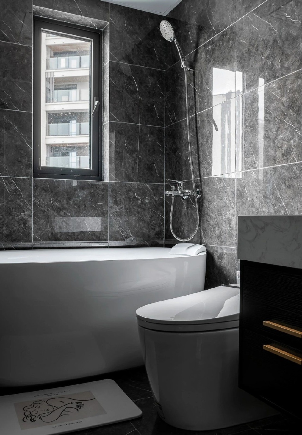 衛生間,深灰色石紋瓷磚滿鋪搭配潔白的衛浴,實用與顏值兼具