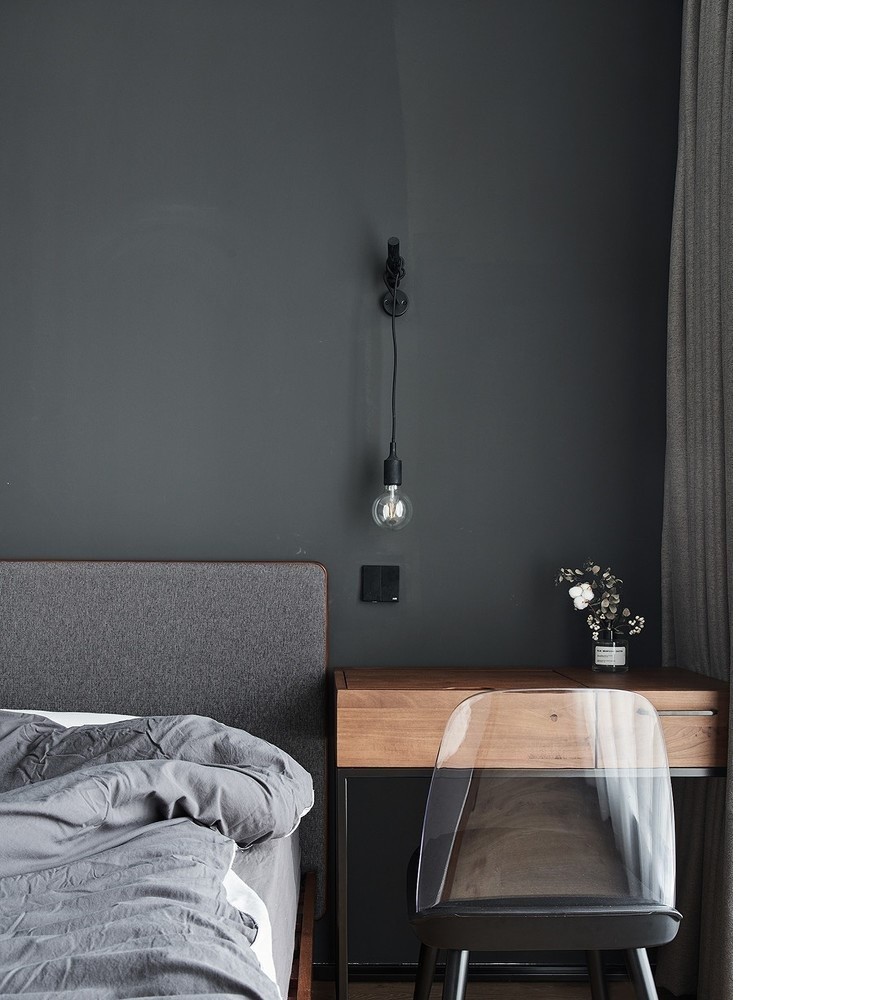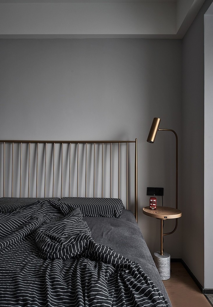 主臥整體以暗灰為主色調(diào),柔軟的織品,溫暖的木地板,完美營造舒適放松的睡眠環(huán)境。