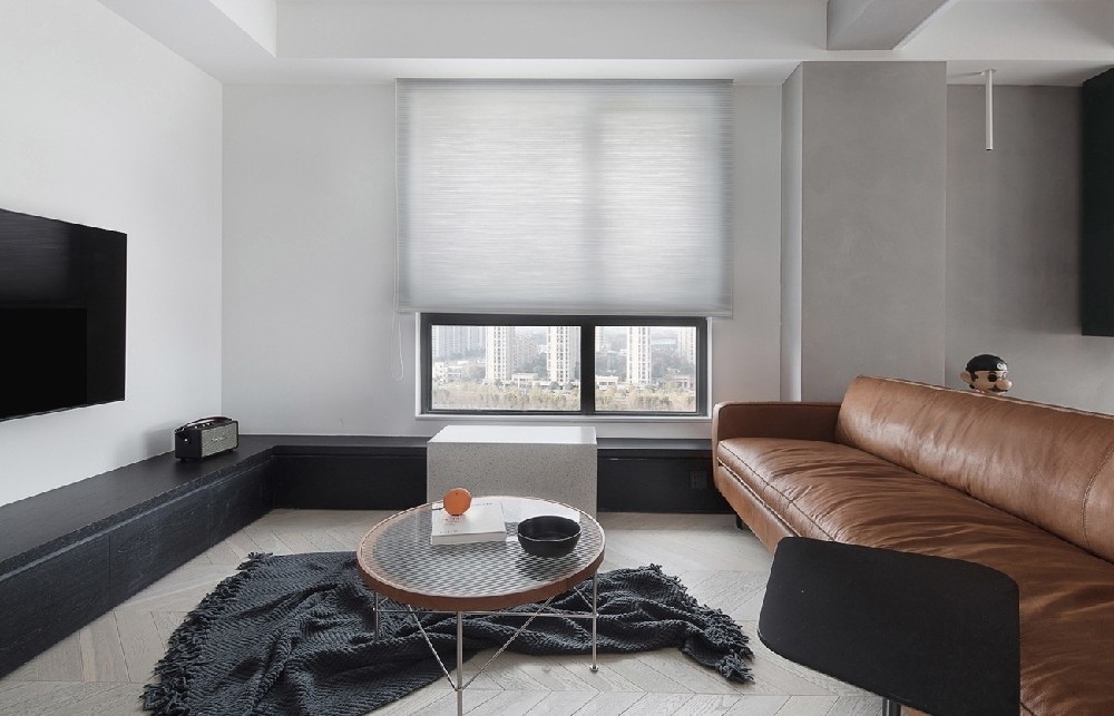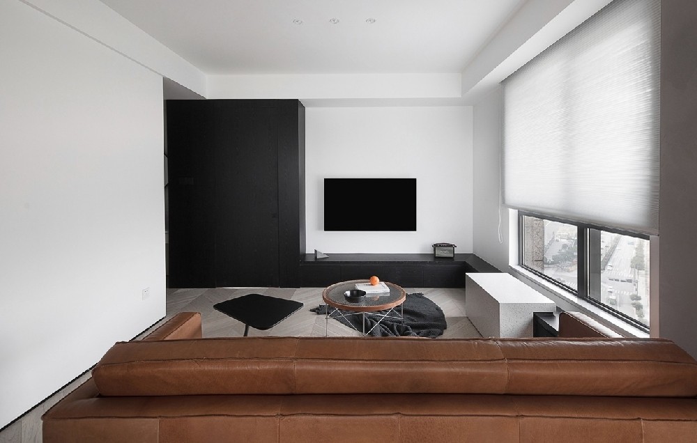 適度留白的簡潔色調,干凈利落的線條感,加以一張棕色雙人沙發、簡約富有線條感的茶幾組 合,整個客廳盈缺妥恰,給人以舒緩治愈的心理感受。