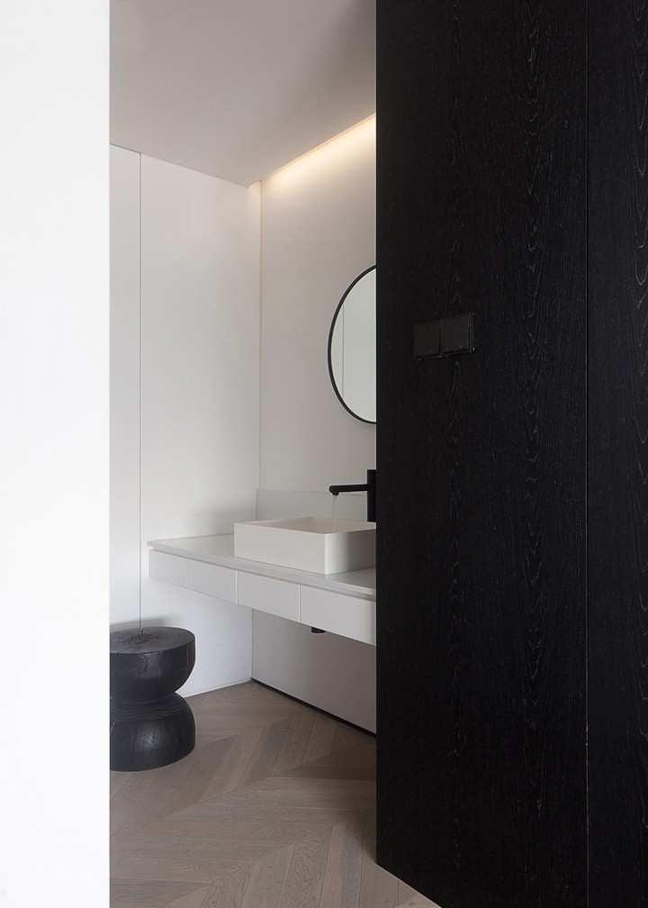 我們高效利用尷尬的轉角位置,將其做成較為隱蔽的干區,形成干濕分離,使得屋主生活更便 捷。圓形的鏡面與隱藏式燈光讓這方小小的空間富有浪漫的生活情調。