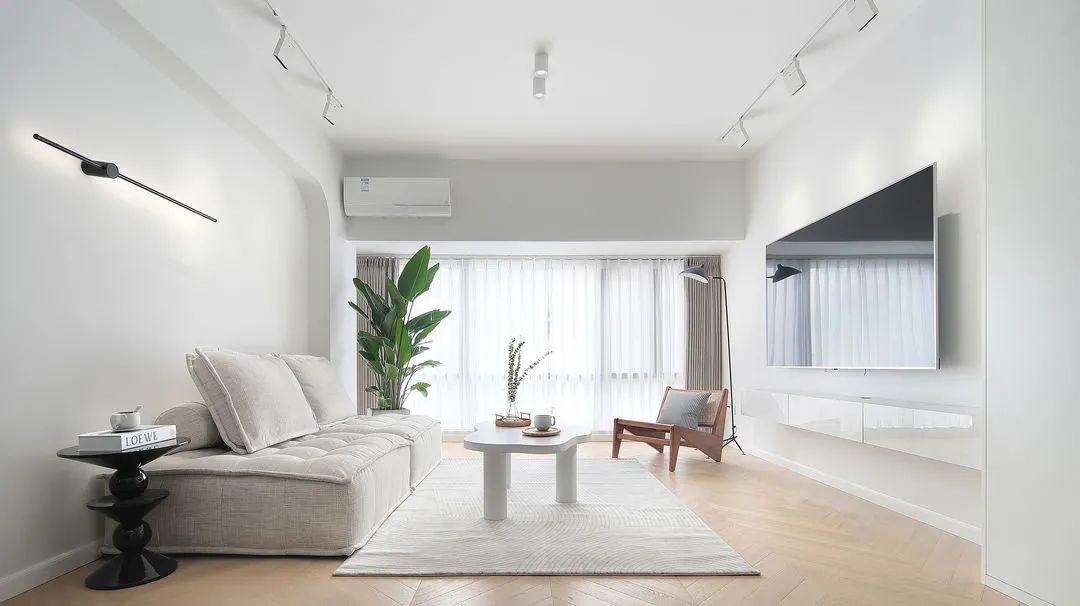 整個空間都是呈現出簡約的狀態,木色作為地面基色搭配素白的色調,綠色作為跳躍色,剛好拼湊在這個空間里。在設計上,沙發背景墻設計了一個有弧度的造型,提升線條美感,放眼望去,會比直角更加柔和。