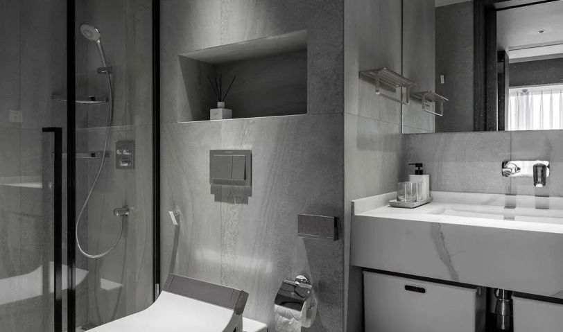 衛生間墻地統一了灰調,在壁掛馬桶的背后留出了壁龕,放置香氛,讓沐浴更衣這件事充滿了儀式感