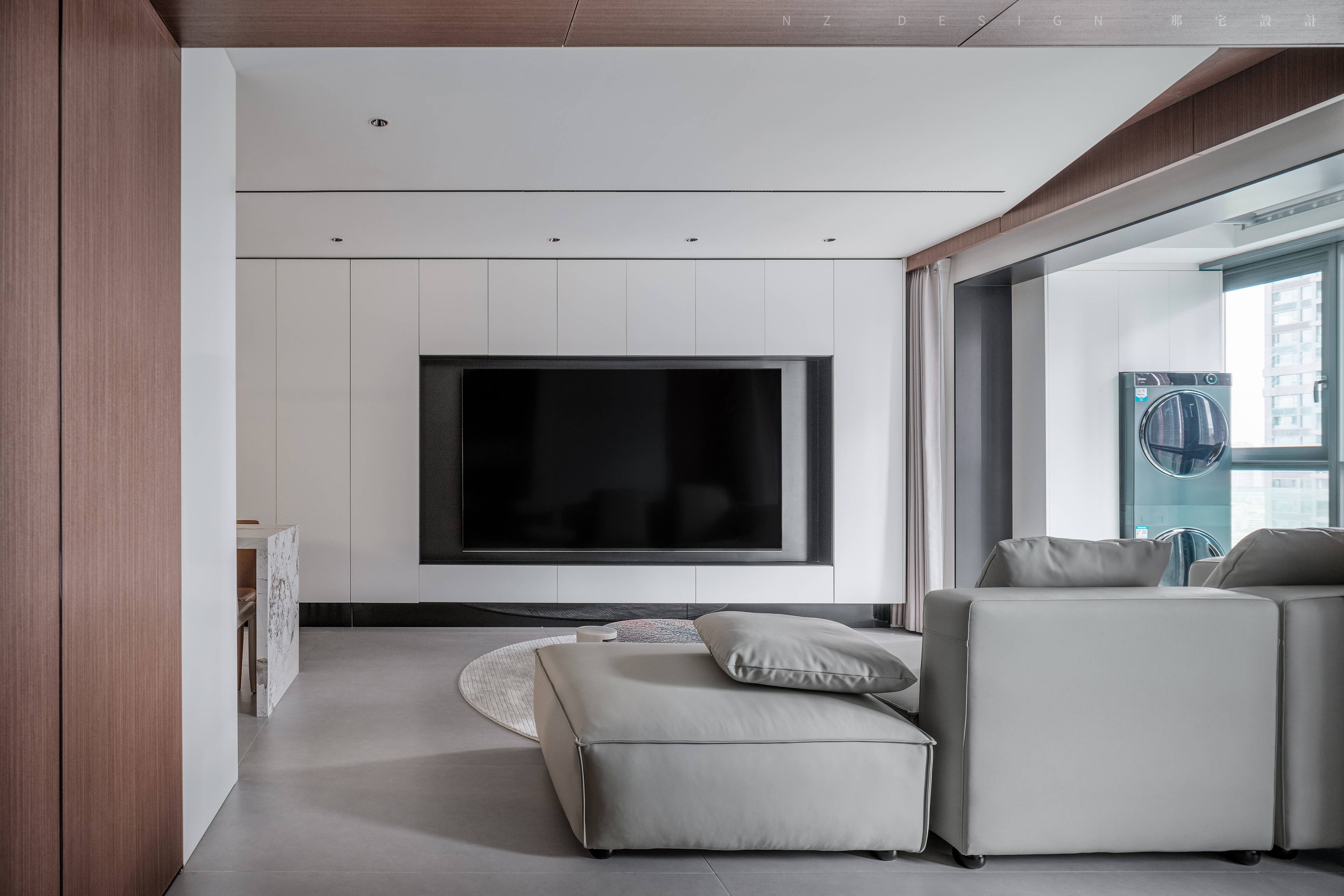 定制的嵌入式純黑不銹鋼套格,通過不同材料的組合銜接,呈現出材質質感與設計的功能 #電視柜