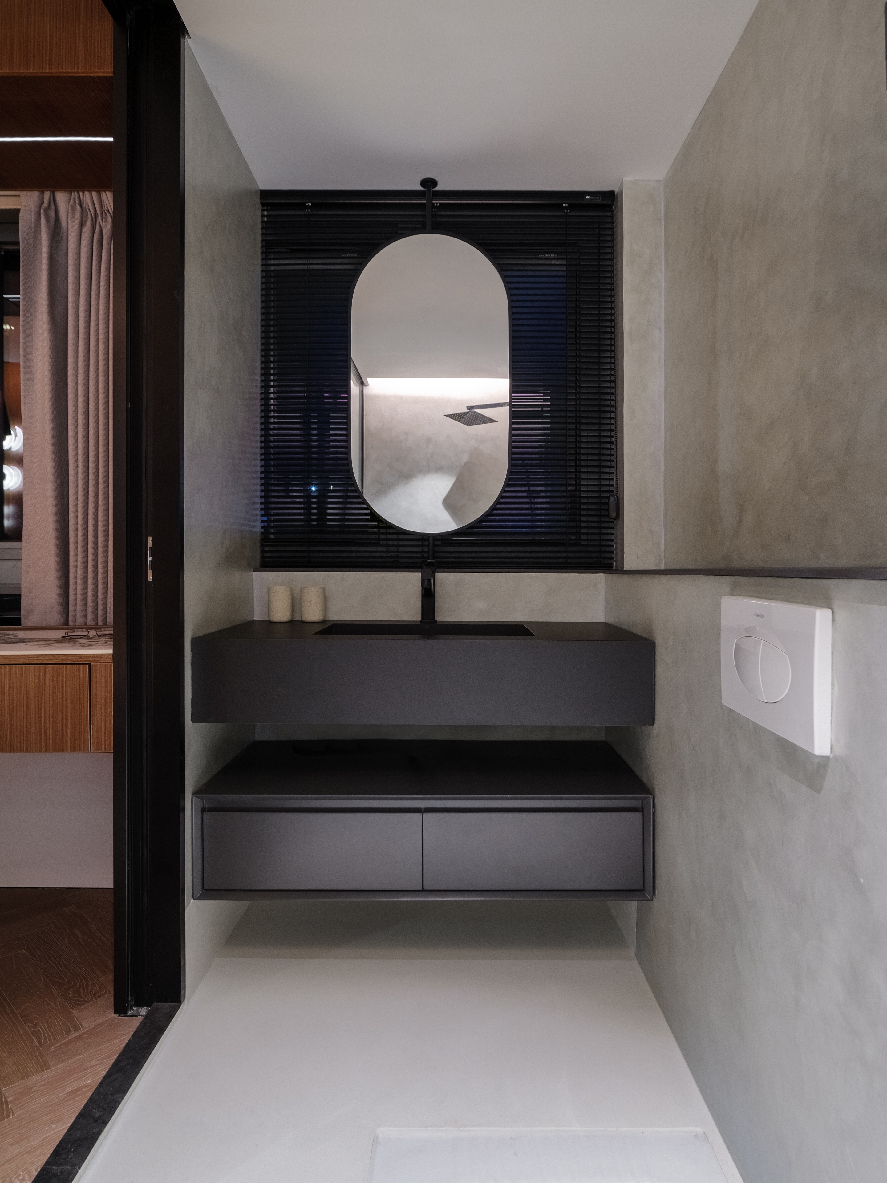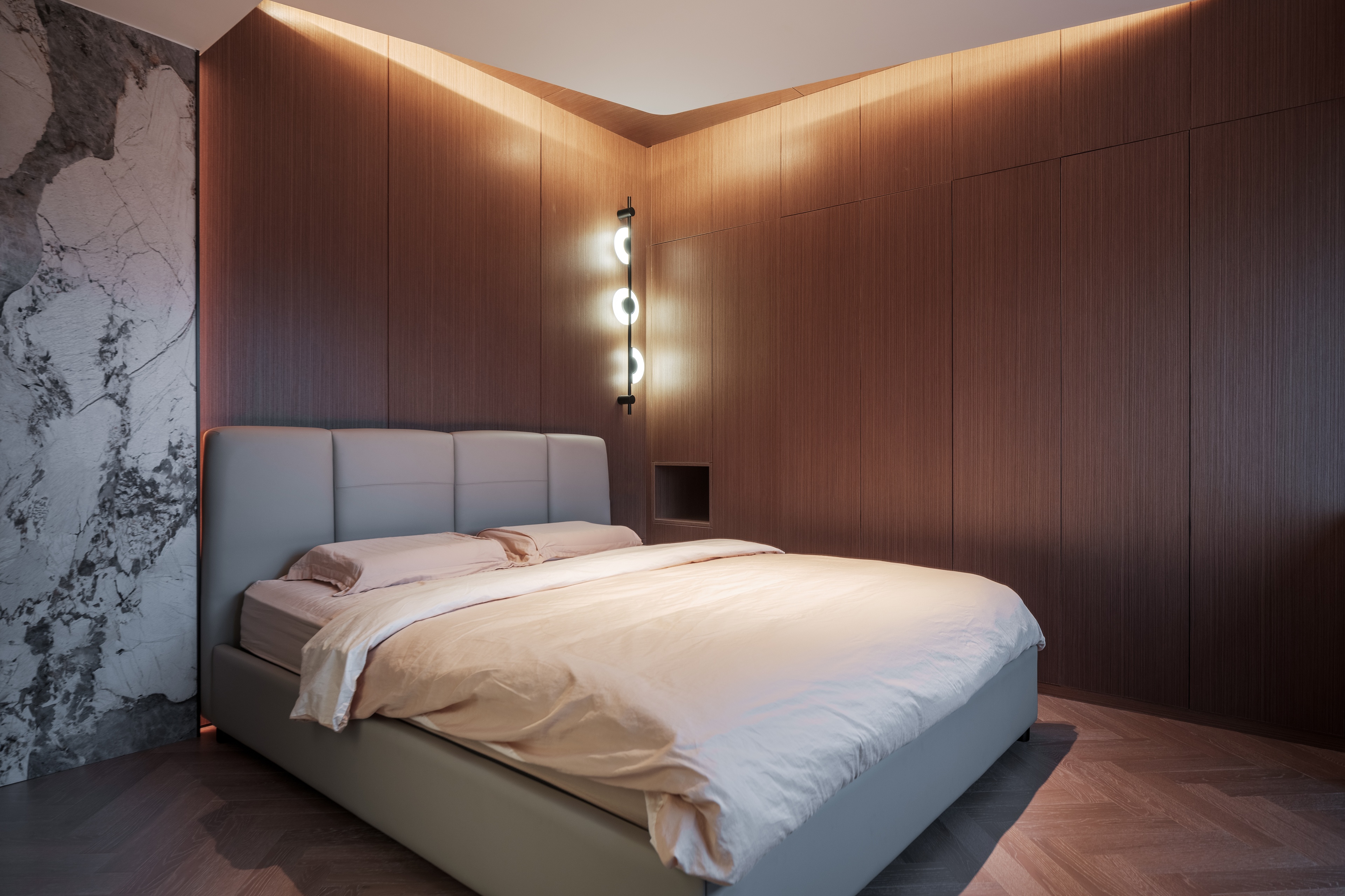 視覺統一異形切割吊頂設計,是契合空間而存在的,借由設計創意轉化成獨具個性的藝術領悟。巖板材質的拼接為空間增加了跳躍的氛圍,定制飾面板柜體收納更集中。