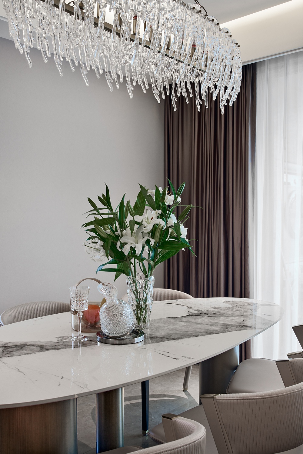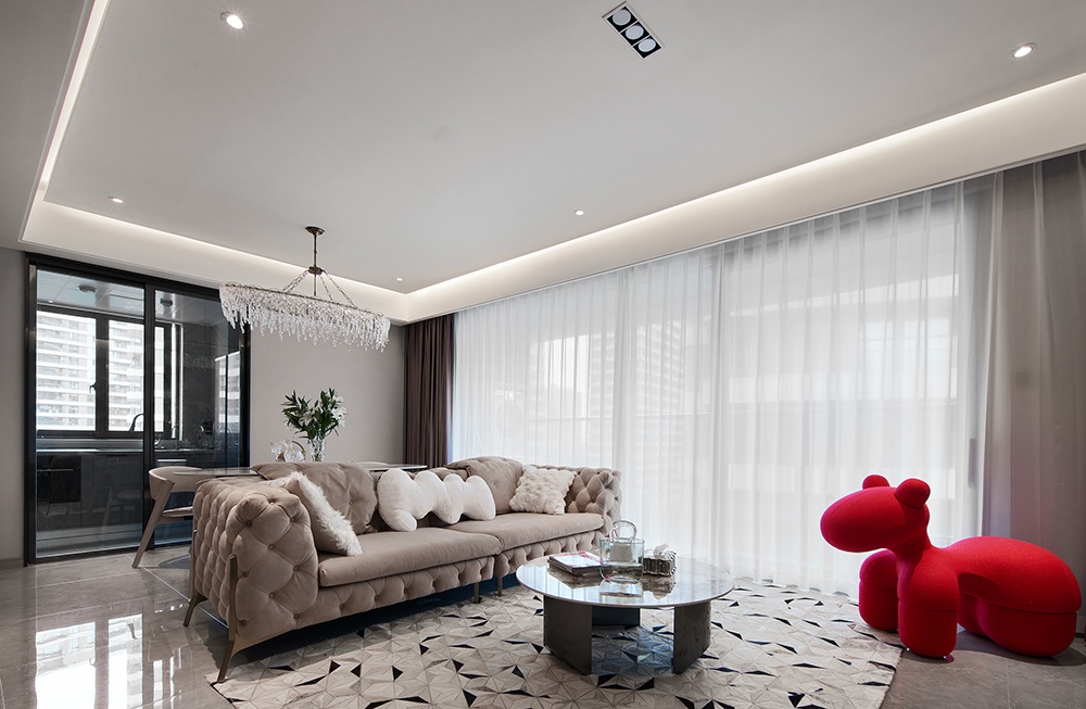 整個(gè)客廳以現(xiàn)代風(fēng)的空間布置,加入時(shí)尚的石材、木飾面等質(zhì)感,搭配上奶咖色絨面沙發(fā)、大理石圓形茶幾,營(yíng)造出一種時(shí)尚優(yōu)雅而高級(jí)的空間氣息。