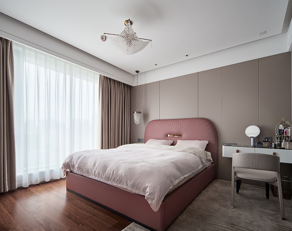 主臥空間的設(shè)計(jì),沿襲了整體輕奢格調(diào),公主風(fēng)閱讀燈與主燈給空間增添不少甜美氛圍。床頭以皮粉色的皮革面靠背為主,再搭配溫潤(rùn)的奶咖色背景墻,整體更具一派雅致風(fēng)格。