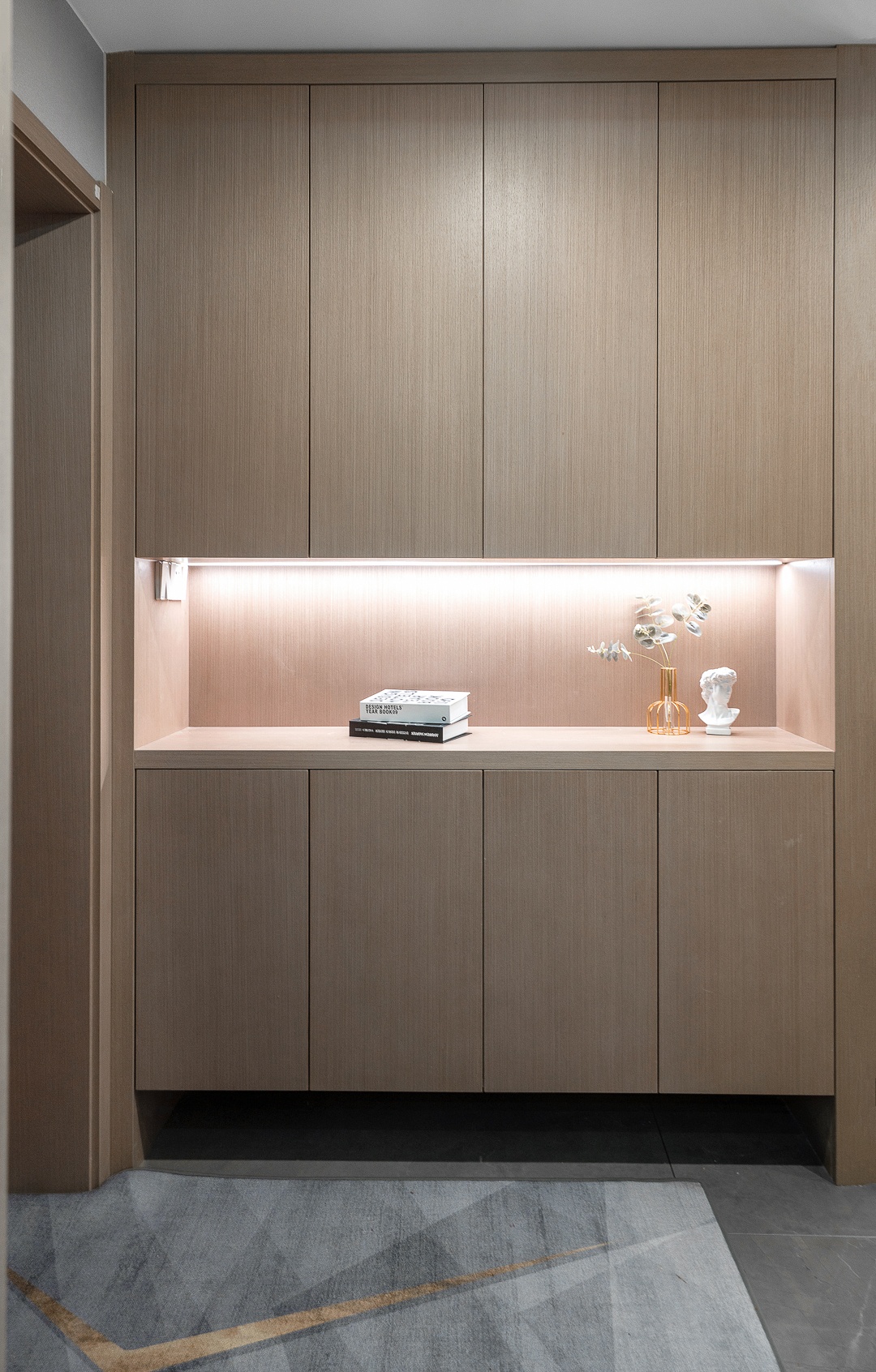 入戶(hù)一側(cè)以原木打造玄關(guān)柜體,給人以清爽自然之感。通頂式柜體收納充足,中間挖空嵌入燈帶,氛圍感升級(jí),儲(chǔ)物空間更加多元化。
