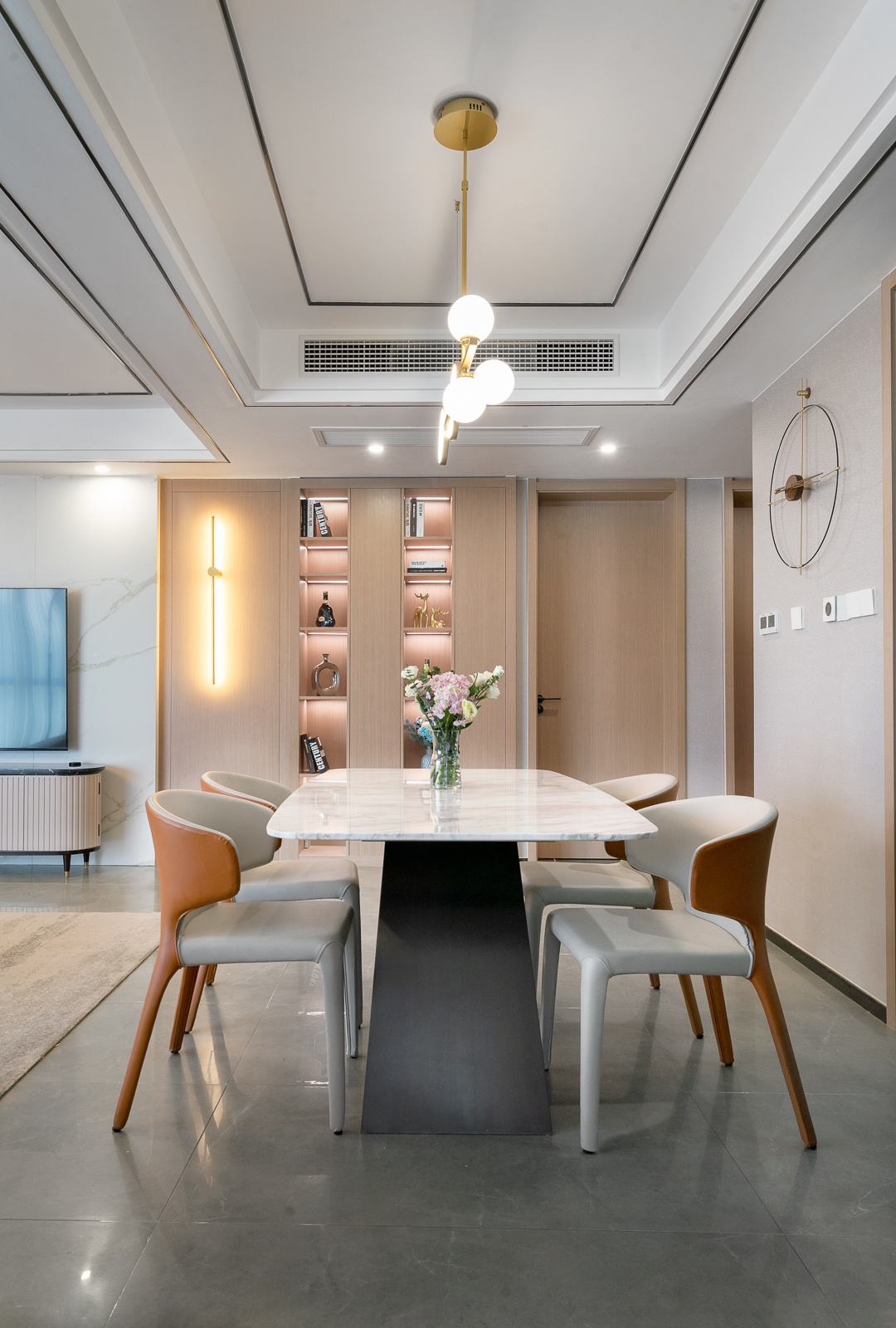 客餐廳處于同一空間內(nèi),木飾面與墻體穿插,讓材質(zhì)和形體的層次感綻放,公共區(qū)域也因?yàn)榫植吭镜馁|(zhì)地而沉浸在柔和的氛圍里。